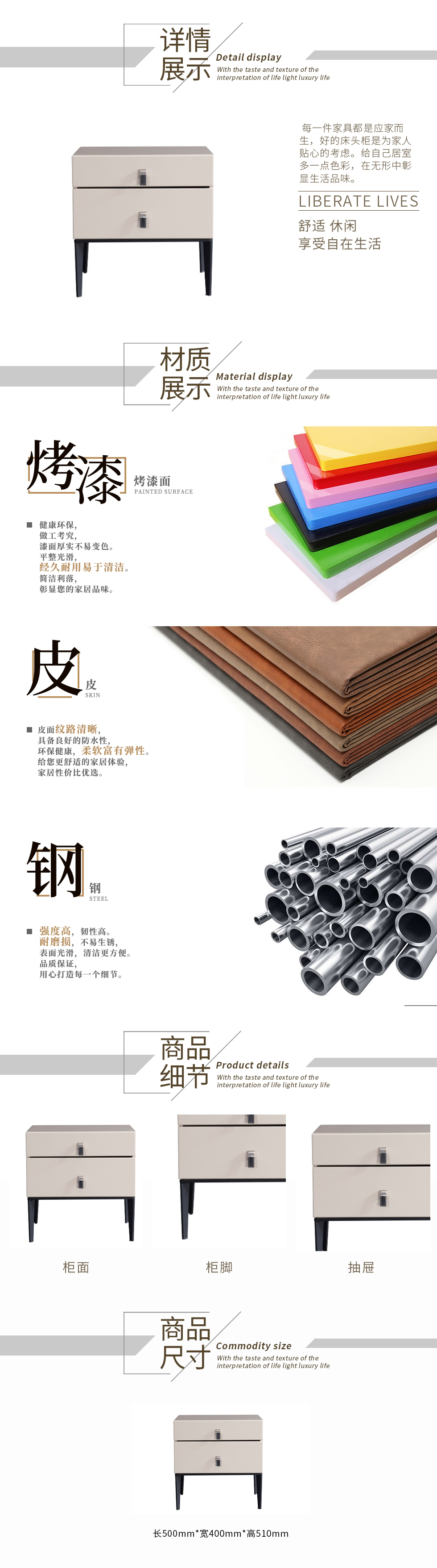 • 现代极简米白色烤漆面+皮质拉手+碳素钢底架黑砂工艺床头柜