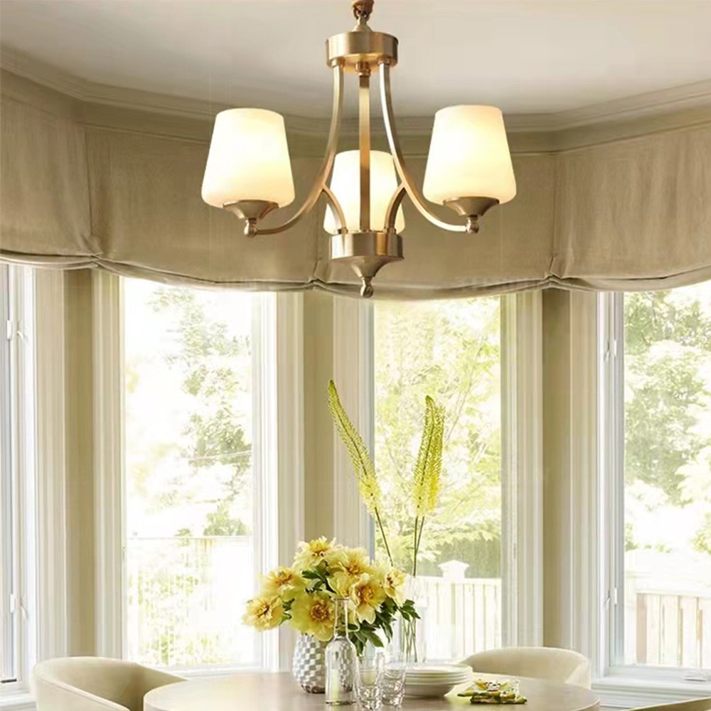 • 美式铜+酸洗内喷白玻璃灯罩吊灯