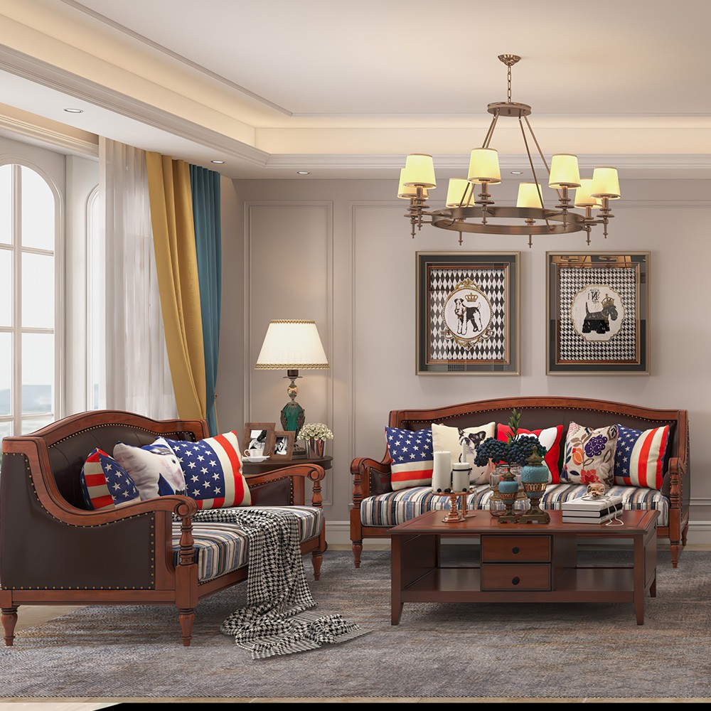 美式橡木框架+棉麻海绵坐垫+仿皮质靠背沙发 - 1+2+3