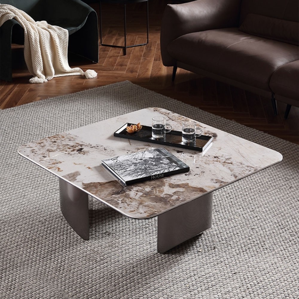 • 极简不锈钢拉丝+岩板餐桌